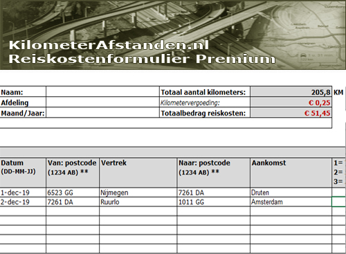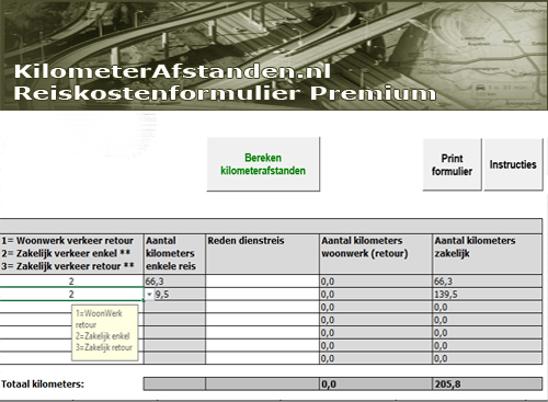 Het ReiskostenFormulier Bedrijven werkt op basis van Windows, Microsoft Excel en Google Maps, snelste afstand, enkele reis per auto. De opgegeven postcodes van vertrek en bestemming worden automatisch door een ingebouwd macro in het formulier berekent. De routeplanner van Google Maps genereert de onderlinge kilometerafstanden. De optelsom van verkregen kilometerafstanden wordt tot slot automatisch vermenigvuldigt met een (variabele) kilometerprijs en levert uiteindelijk een te declareren bedrag op.